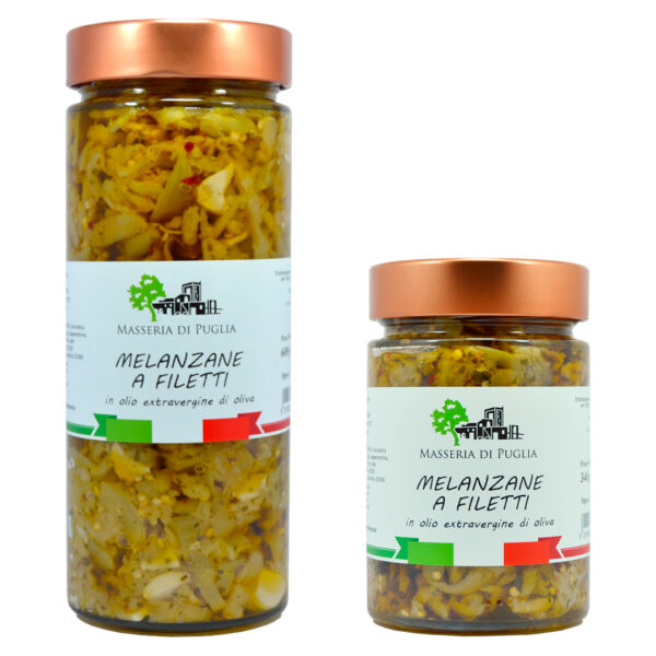 Malanzane a filetti(60%), olio extravergine di oliva (35%), aglio, peperoncino, aromi naturali, aceto di vino, sale.